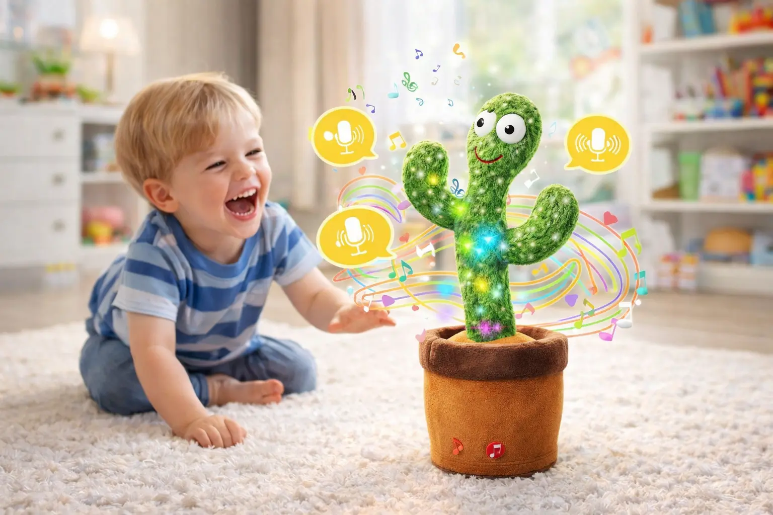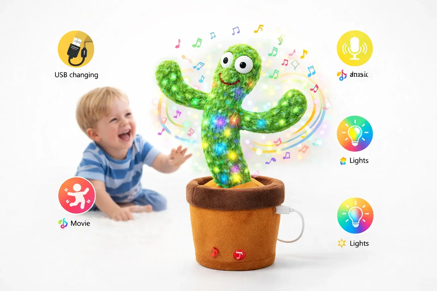 - لعبة صبار محشوة لطيفة يمكنها الرقص على الإيقاع، الغناء، التكرار، التسجيل، والتوهج بالأضواء.